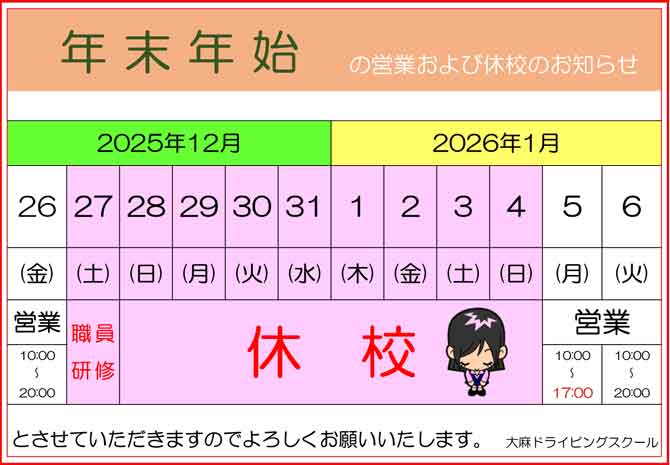 - ★年末年始の営業および休校のお知らせ