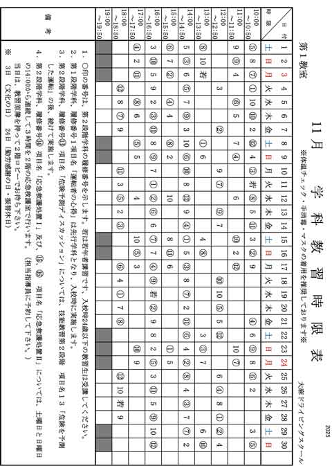 11月学科教習時限表